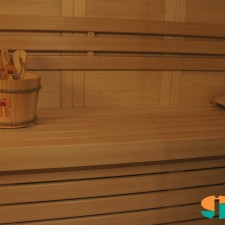Finska savna, vgrajena v prostor, prednja stena savne obložena z keramičnimi ploščicami in lesom. Za ogrevanje savne je prosto stoječa peč s 100 kg vulkanskega kamenja.